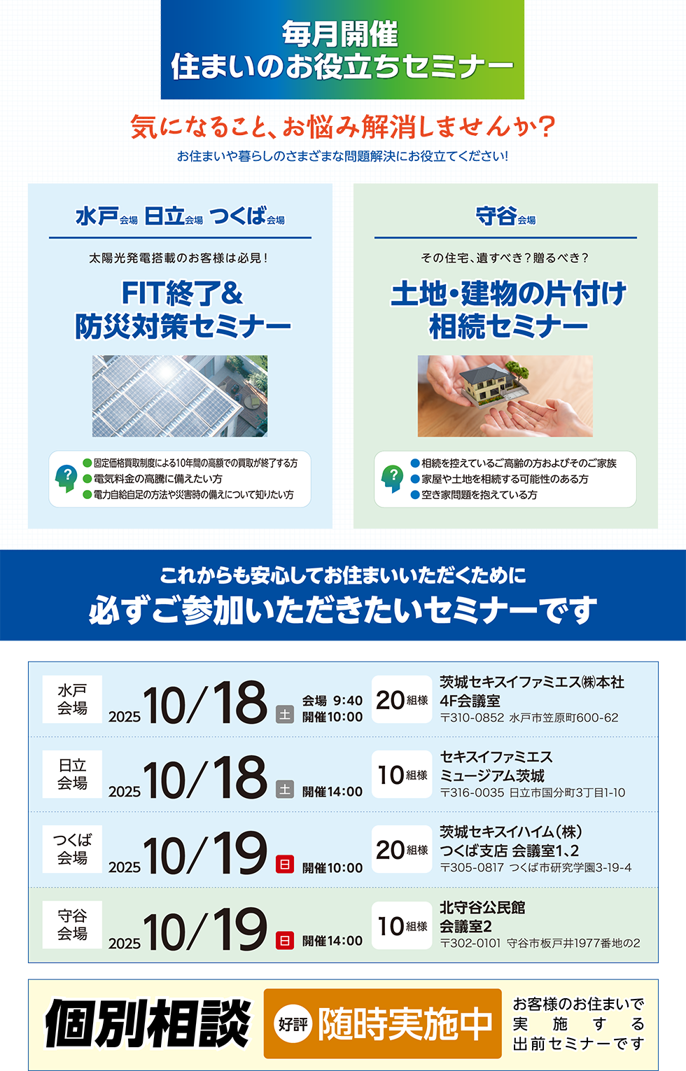 【セキスイハイム・ツーユーホーム ご入居者様限定】住まいのお役立ちセミナー&個別相談会のお知らせ 本セミナーは、茨城エリアのセキスイハイム・ツーユーホームにお住まいのお客様が対象です。 セミナーに応募する
